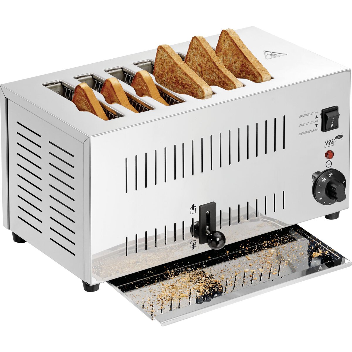 Mit Wahlschalter zum Toasten von 2, 4 oder 6 Toast-Scheiben (manueller Auswurf), Schlitzgröße: 14,5x2x13,5 cm. 1 Bedienhebel für 6 Schlitze, Wahlschalter für die Inbetriebnahme der Toastschlitze in 2er Gruppen, für Toast- und Sandwich-Toast, herausnehmbare Krümelschale, Material: Edelstahl, Timer/Zeiteinstellung 1-5 Min., Signalton nach Ablauf der Zeit. Gewicht 5,6 kg.