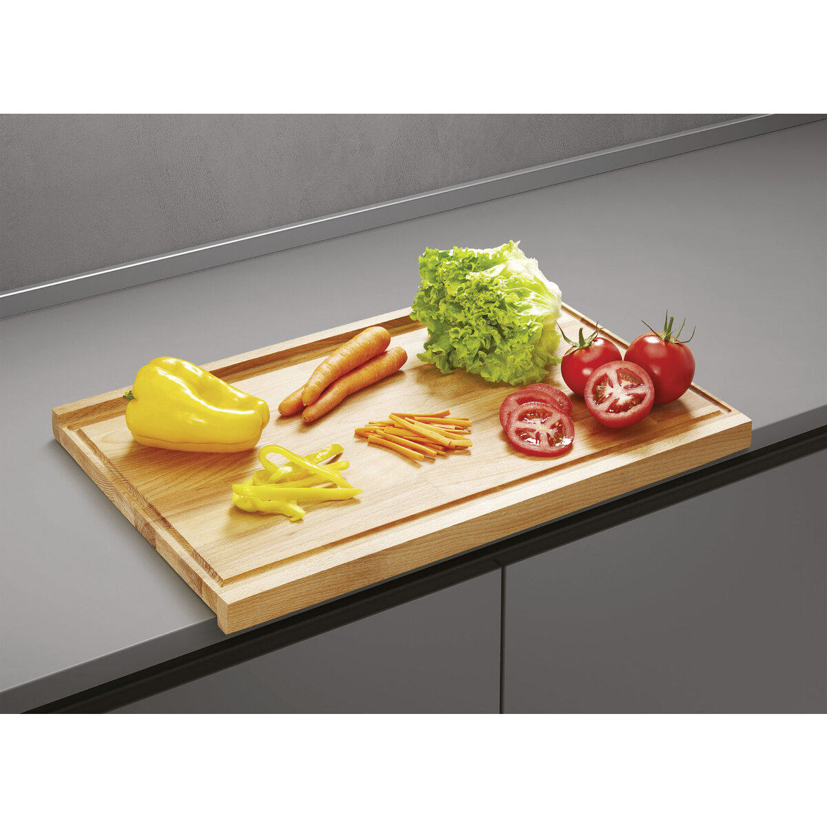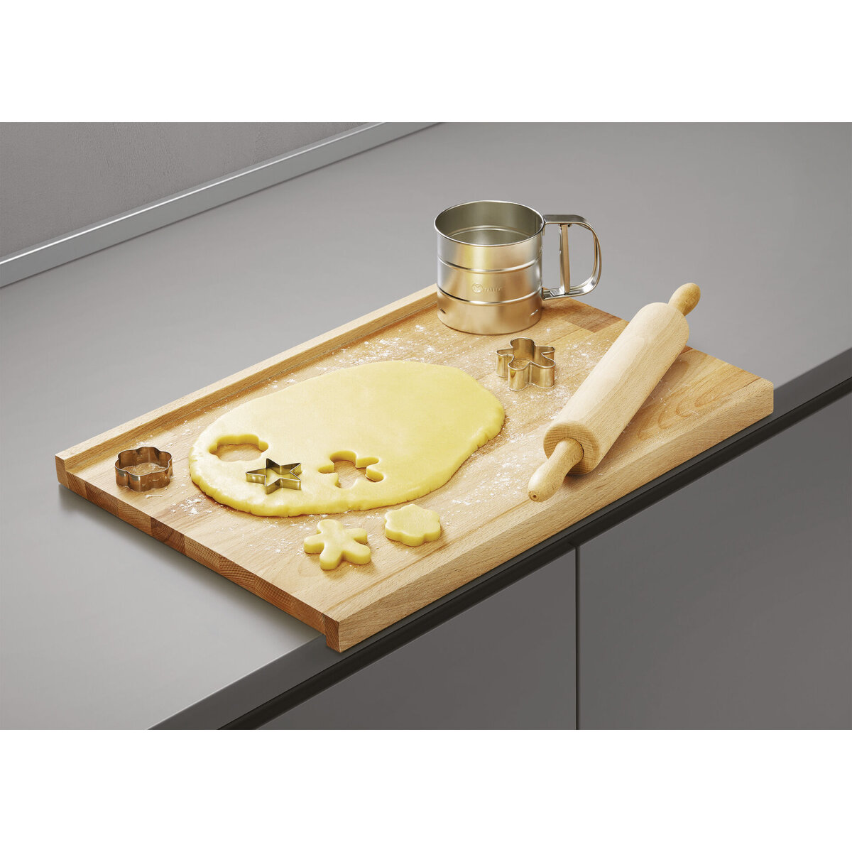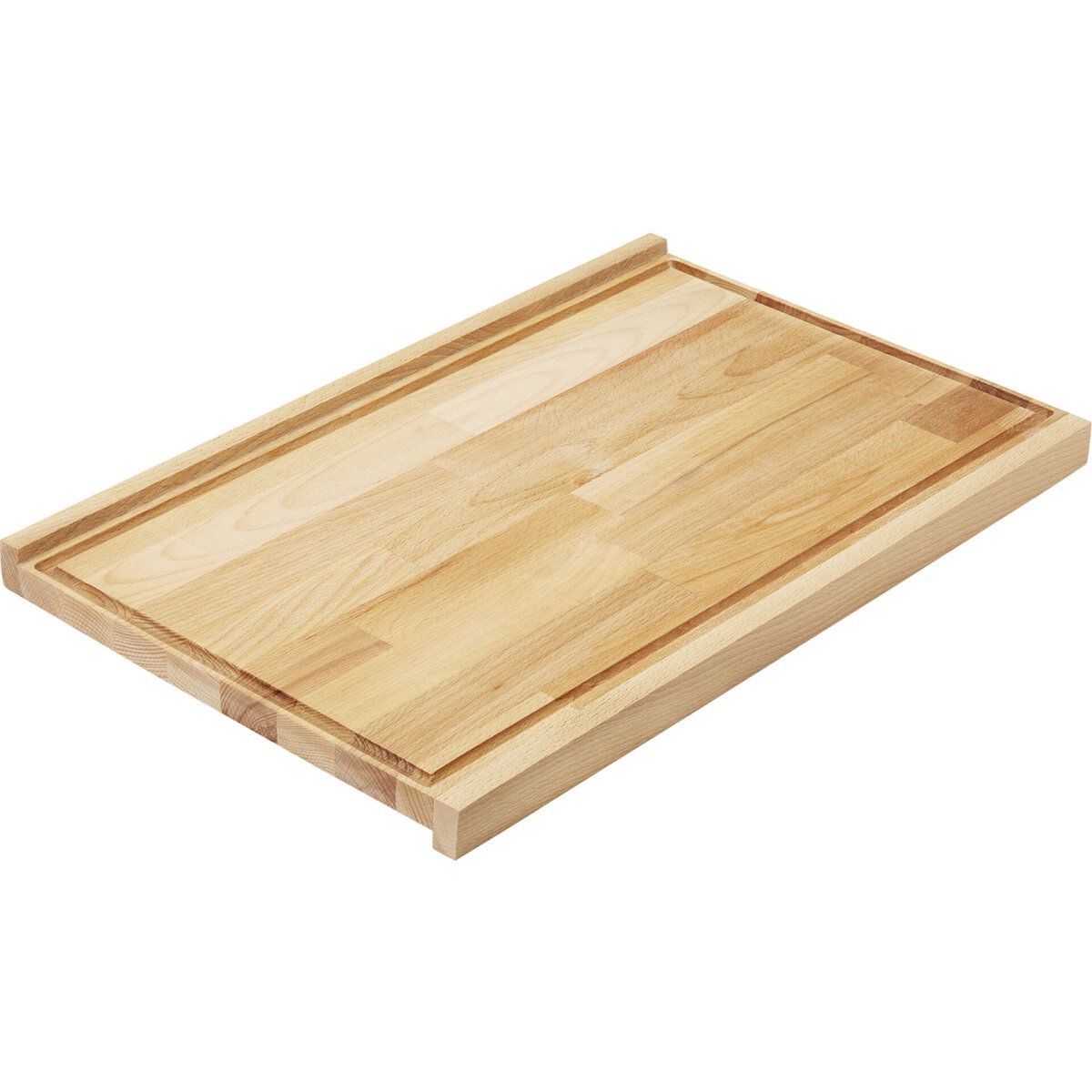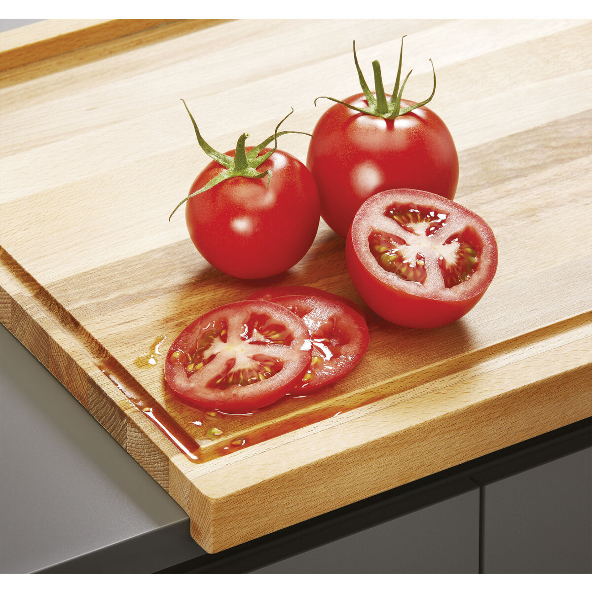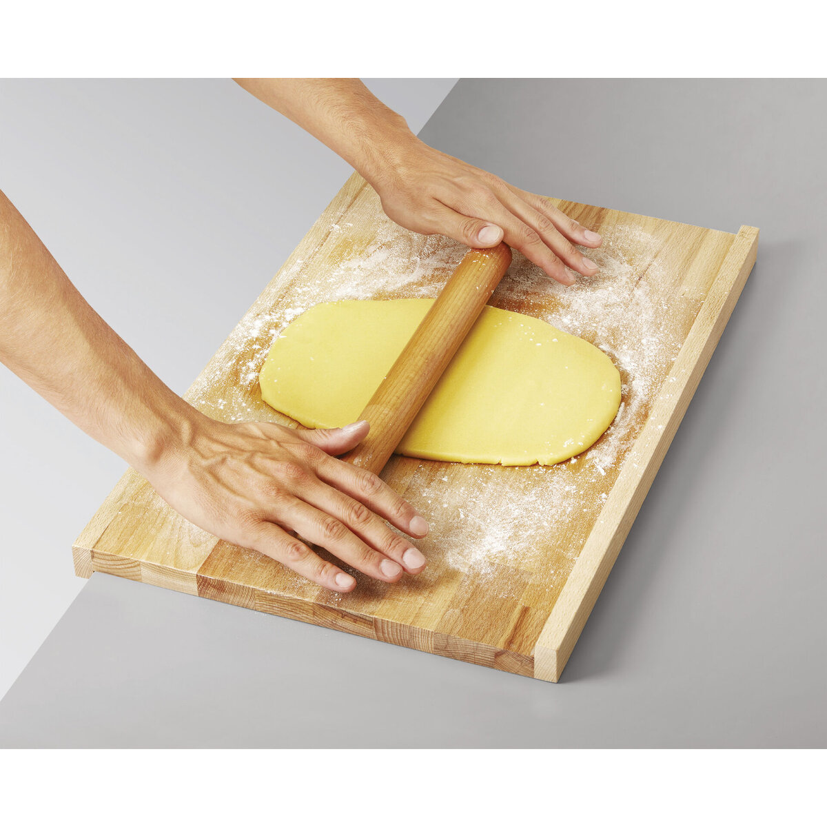Buchenholz. Beiseitig verwendbares Back- und Schneidbrett mit Gegenkantenstopper. Saftrille auf einer Seite.