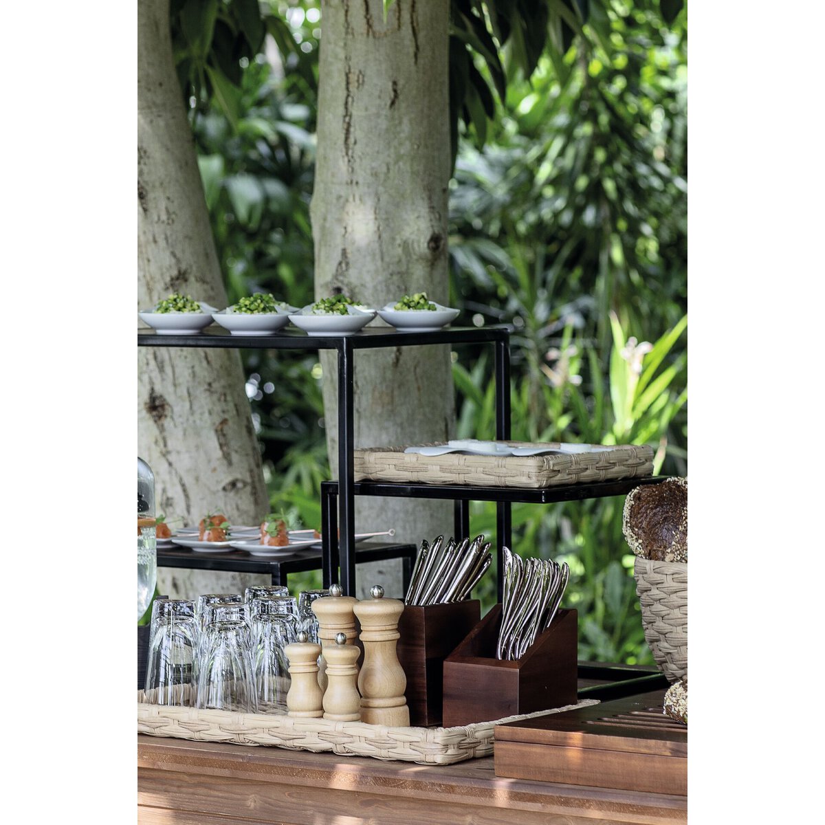 Akazienholz, braun. Abgeschrägt: Höhe vorne 8 cm, hinten 14 cm. Nicht spülmaschinengeeignet.