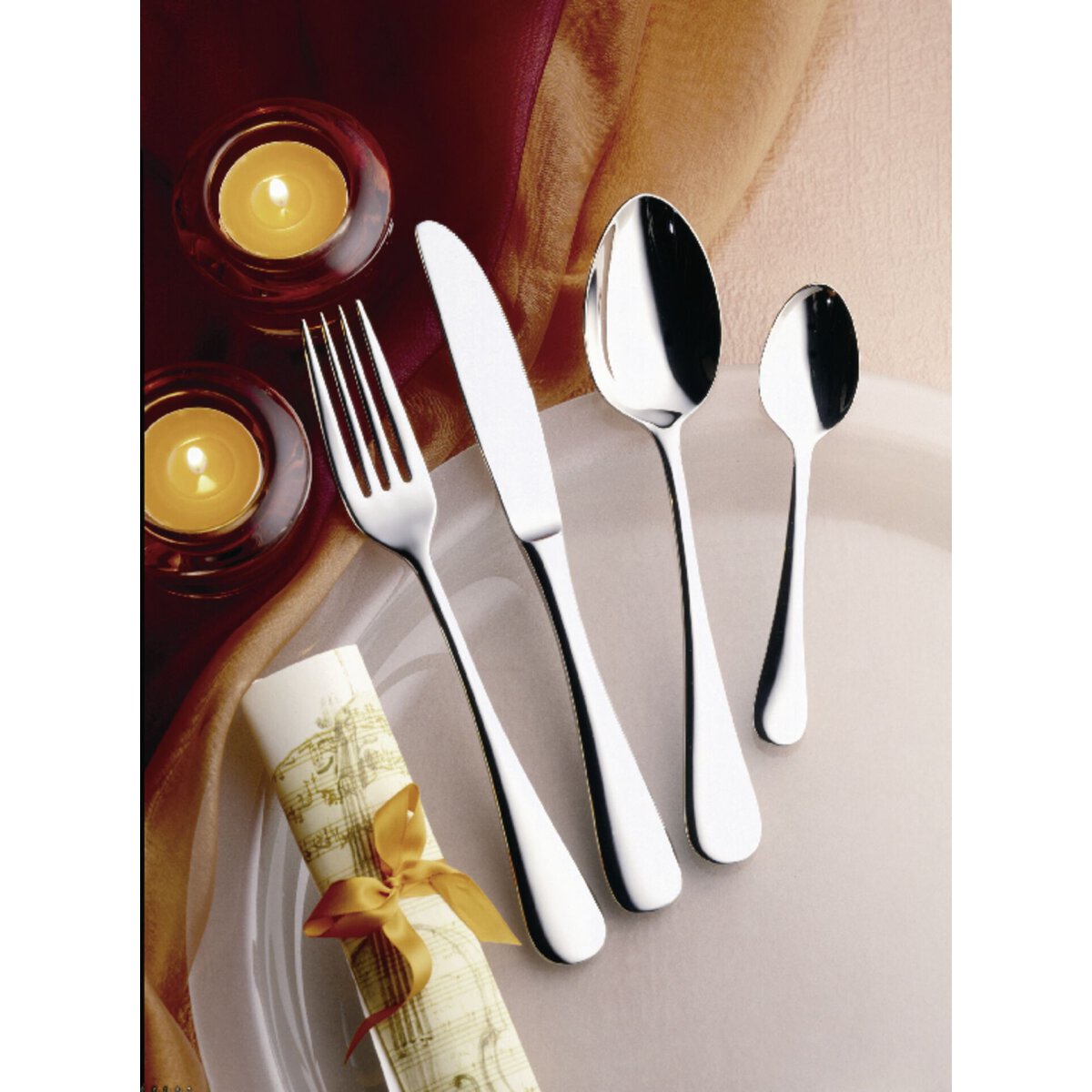 Chrom-Nickel-Stahl 18/10, rostfrei, poliert. Messer mit geschmiedeter Klinge. 3 mm stark. Qualitätsbesteck. Hohe Stabilität.