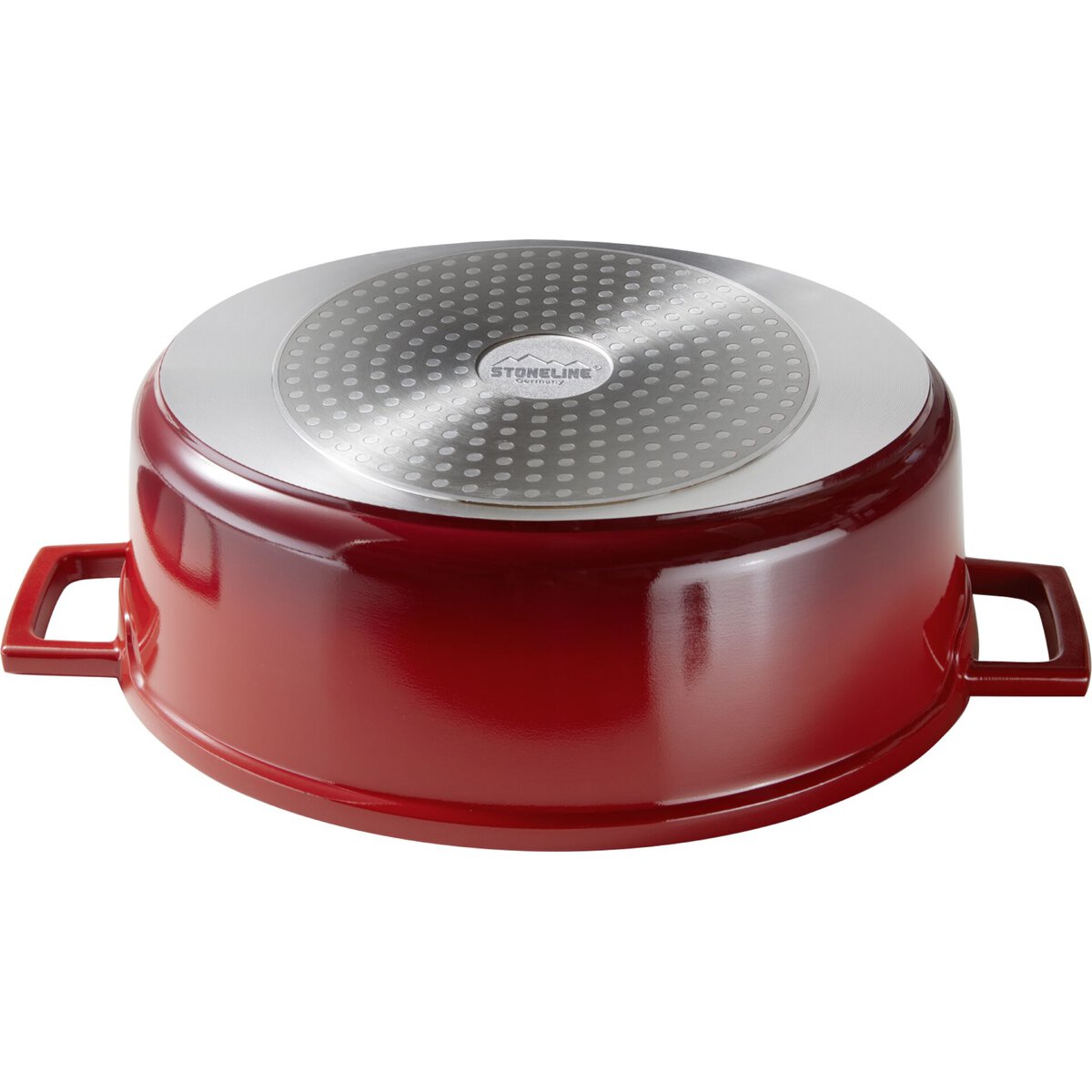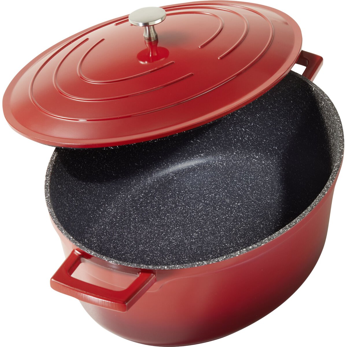 Aluguss antihaft, rot. Länge mit Griffen: 41,1cm. Enthält 1 Bräter, 1 Aluguss-Deckel mit Selbstbefeuchtungskreislauf (Zacken) und 2 Thermoschutzgriffe. Antihaft-Beschichtung mit echten Steinpartikeln. Extra starker, verzugsfreier Boden. Bodenstärke: 4,5mm. Backofengeeignet bis 240°C (ohne Thermogriffschützer) / 200°C (mit Thermogriffschützern). Für alle Herdarten geeignet auch Induktion (Induktionsboden Ø19,6cm). Nicht spülmaschinengeeignet.
