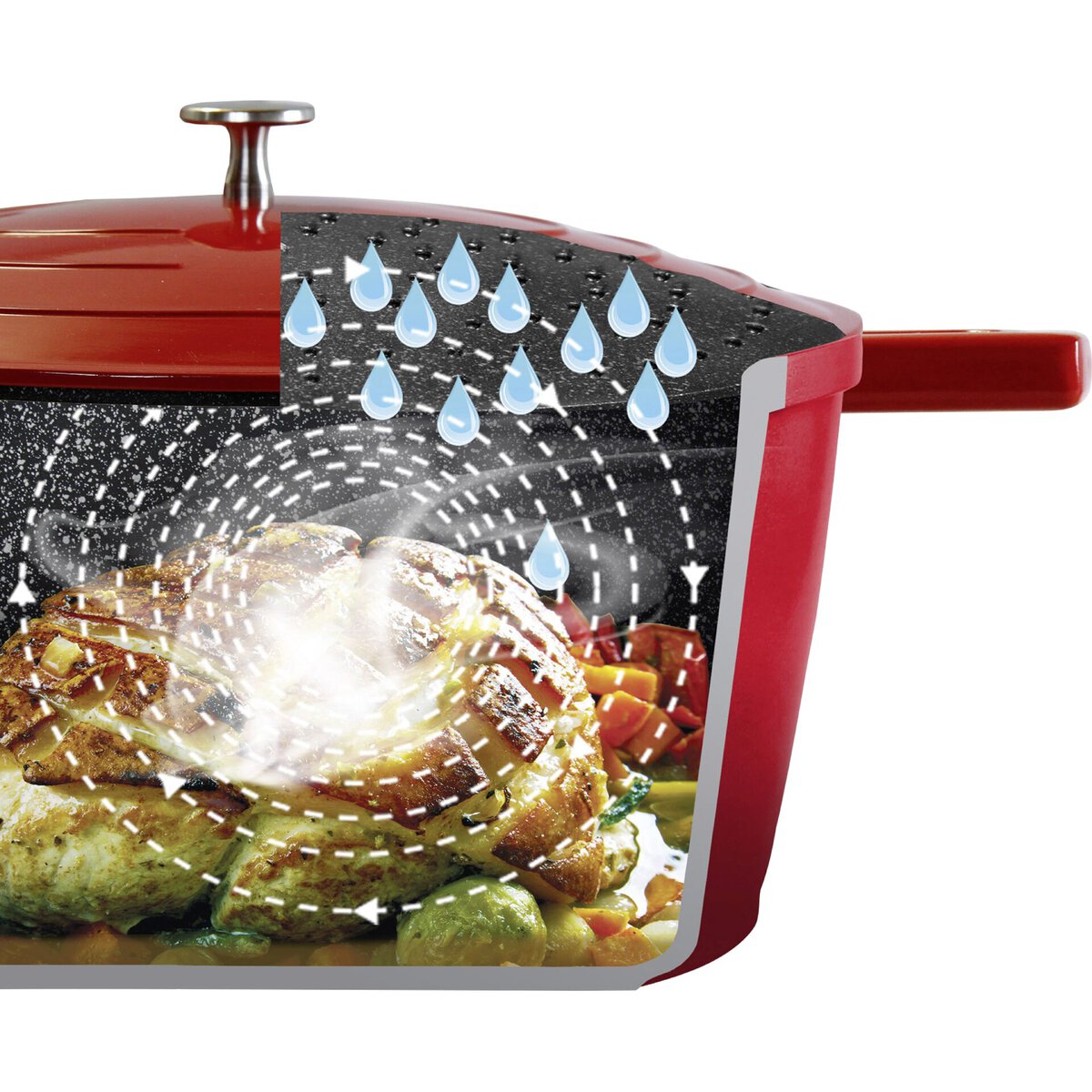 Der speziell entwickelte Deckel dieser Bräter ist mit Zacken ausgestattet und besitzt eine gewölbte Deckelform. Durch den dadurch entstehenden Selbstbefeuchtungskreislauf erhalten Sie ein knuspriges und saftiges Ergebnis, da Ihre Speisen während des Garvorgangs kontinuierlich befeuchtet werden. Dieser sogenannte Aroma-Regen bewahrt das Gargut vor dem Austrocknen, gart Ihre Speisen schonend und verstärkt den natürlichen Eigengeschmack der Speisen.