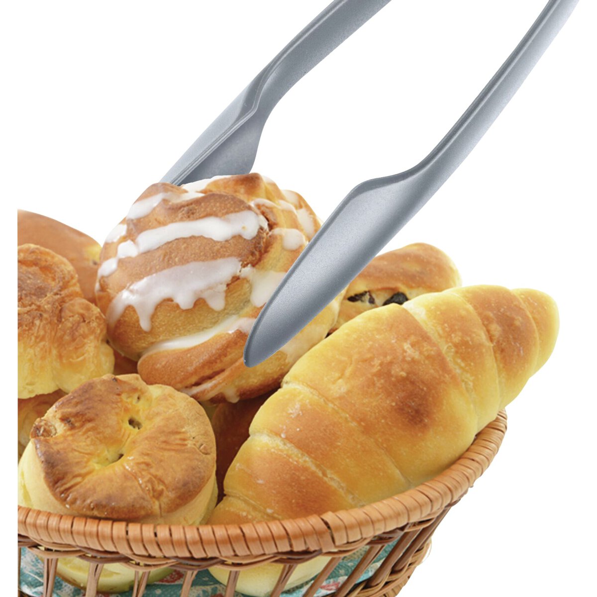 PP, stabiles Zangenset (schwarz/grau), hält auch kleine, rutschige oder ölige Lebensmittel wie z.B. Oliven oder Eiswürfel sicher durch eine spezielle Ausformung, ineinander geklickt platzsparend aufbewahrt, spülmaschinengeeignet.