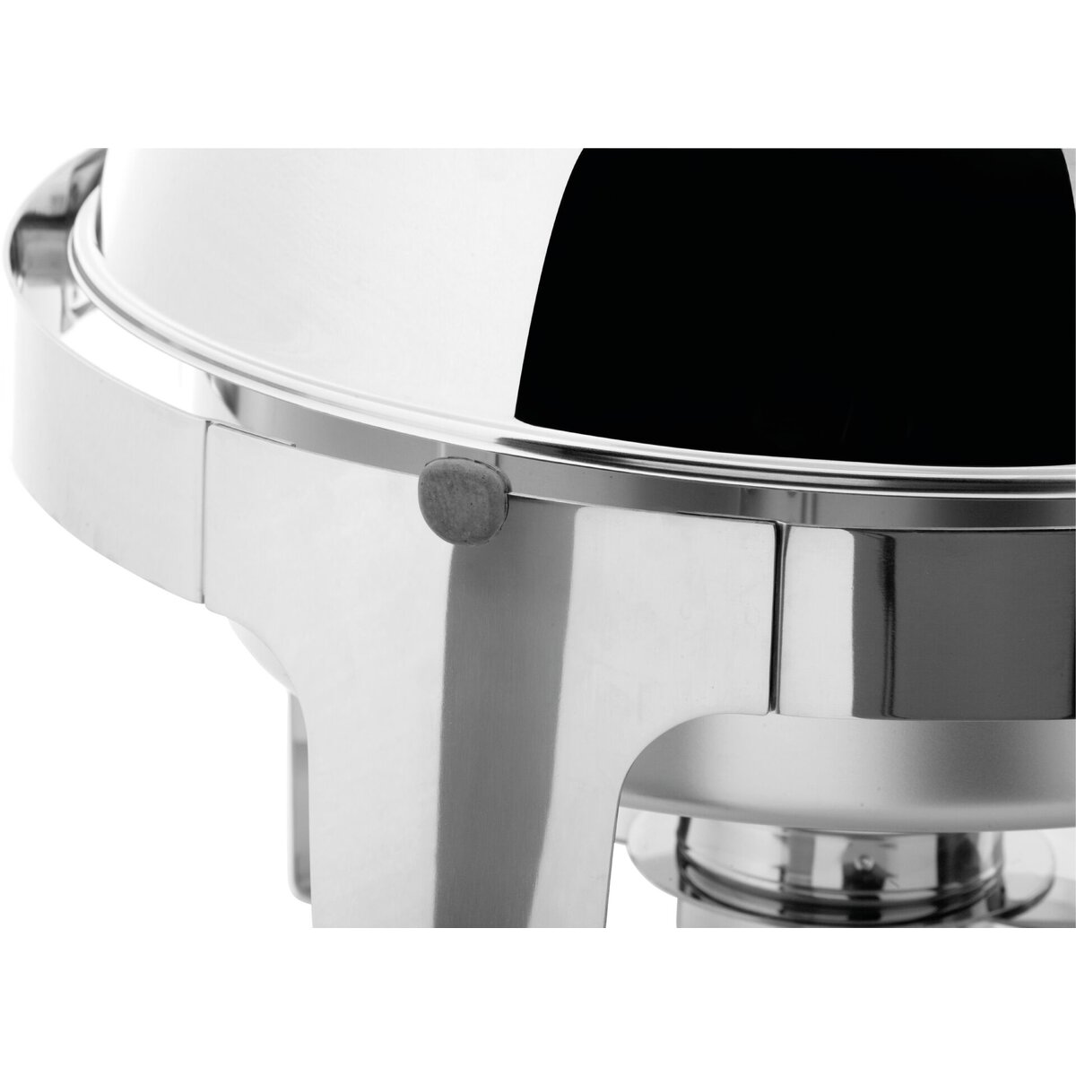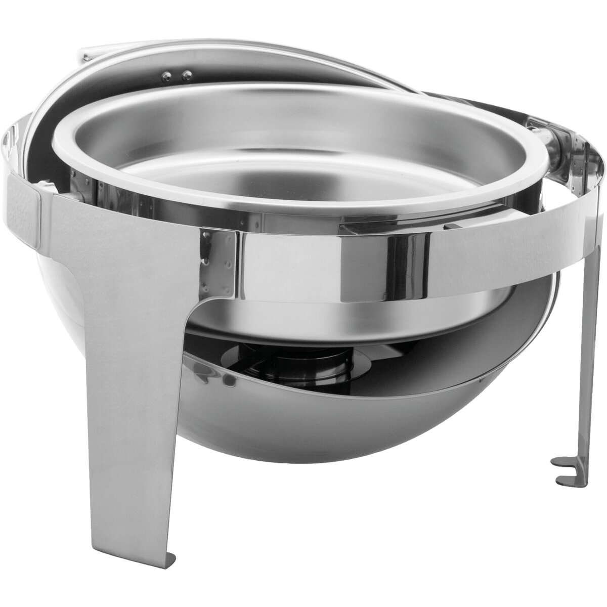 Edelstahl 18/10, poliert, rund mit Rolltopdeckel. Inhalt: 6 Liter. Komplett mit Einsatz 65 mm tief und einem Brennstoffhalter. Schwere Ausführung.