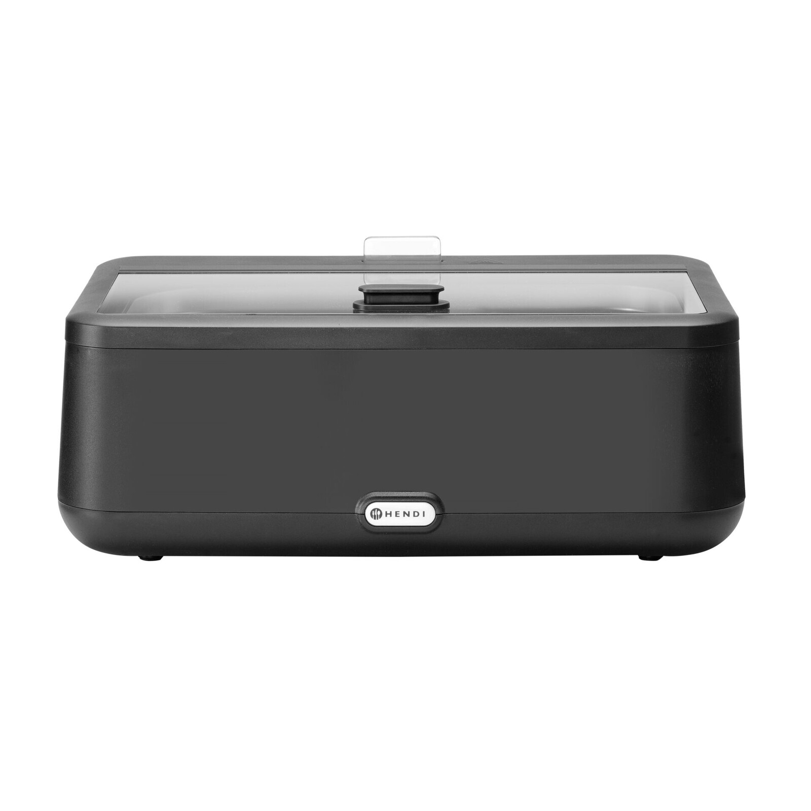 Chafing Dish "Uniq". Gehäuse aus PP. Herausnehmbarer GN1/1 Behälter (H:100mm) aus AISI 304 Edelstahl inklusive. Heizelement aus Edelstahl AISI 304, das für eine effiziente Wärmeübertragung in den Wasserbehälter sorgt. Gehärteter Glasdeckel mit isoliertem Griff, Pfannenkerbe und Aluminiumscharnier. Integrierter Kartenhalter am Deckel für die Speisenbezeichnungen. Das empfindliche Wassersensormodul erinnert den Benutzer daran, wann es Zeit ist, den Wasserbehälter nachzufüllen und verhindert so ein Trockensieden. Digitales Bedienfeld mit Anzeige der Gesamtbetriebszeit, der eingestellten Temperatur und der tatsächlichen Temperatur. Die letzte Temperatureinstellung wird im Speicher registriert und jedes Mal ausgewählt, wenn die Stromversorgung eingeschaltet wird. Die Temperatur kann von 35 bis 85°C in Schritten von 1°C eingestellt werden. Maximalfülllinie ±4 Liter. Nicht zum Kochen bestimmt, nur zum Warmhalten.