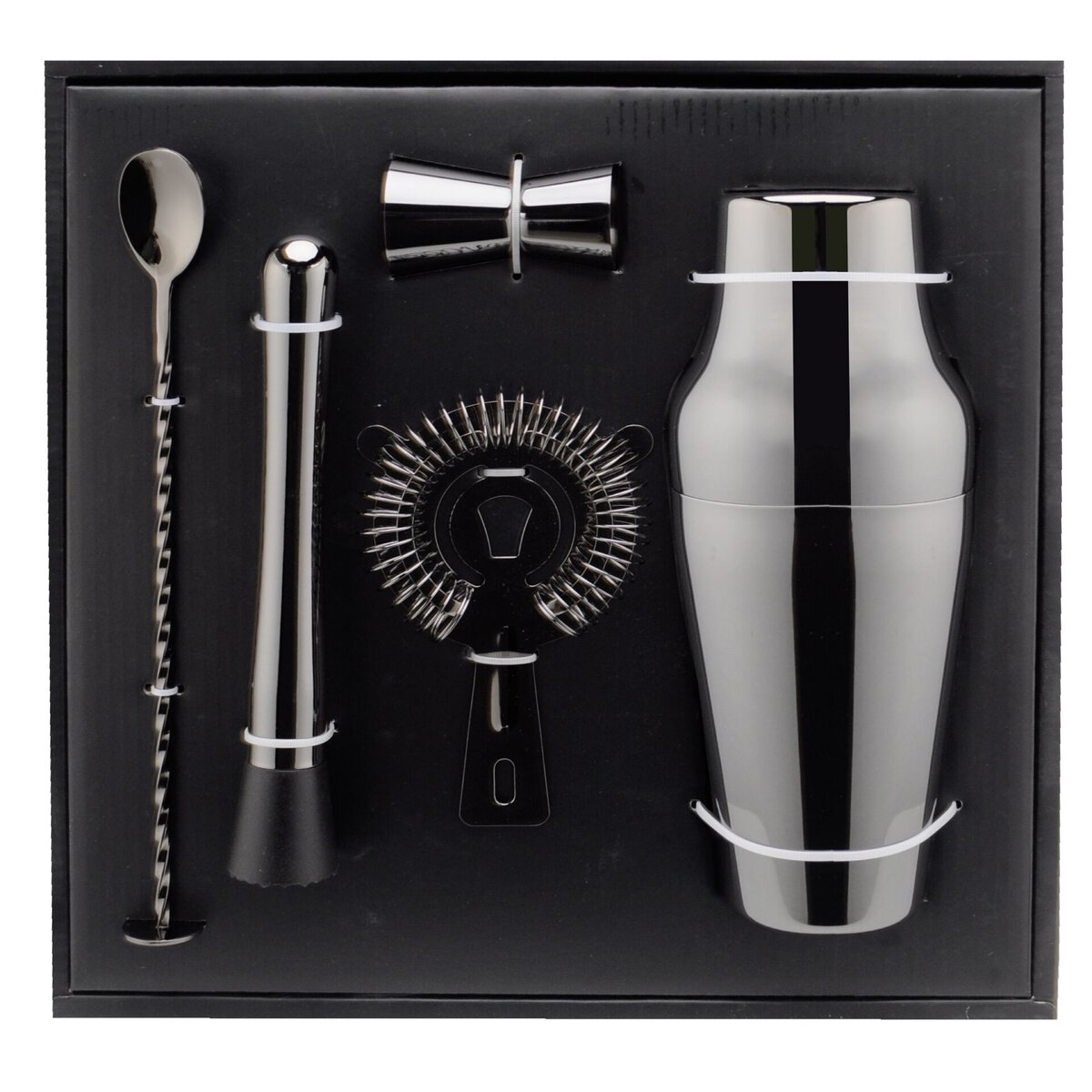 Set bestehend aus: 1x Shaker mit Deckel 600ml, 1x Cocktailmaß 30ml/20ml, 1x Cocktailsieb, 1x Stößel, 1x Barlöffel. Lieferung in Geschenkkarton. Spülmaschinengeeignet.