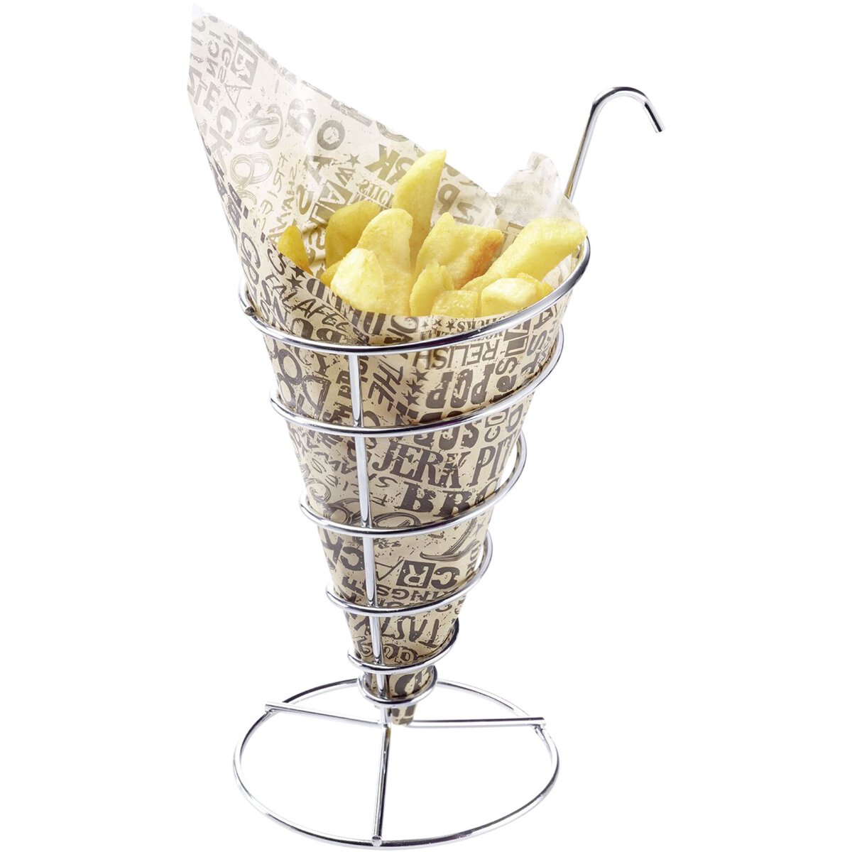 Fettdichtes Einschlagpapier mit lebensmittelechter Beschichtung. Universell verwendbar für alle Servierkörbchen. Vielseitig form- und einsetzbar z.B. für konisch geformte Pommes-frites Ständer, Fish&Chips, Pommes und Co., aber auch zum Verpacken von belegten Broten und Brötchen.