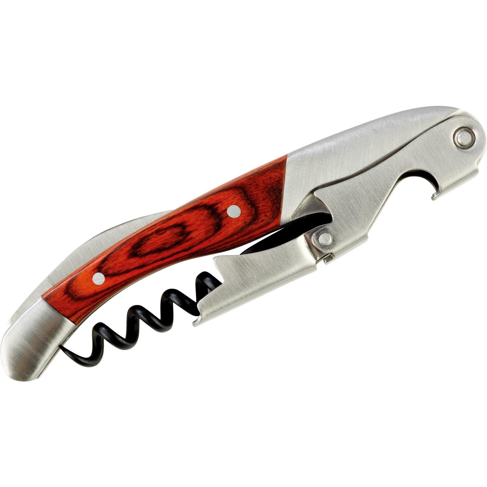 Edelstahl/ Holz, mit edlem Holzgriff, inkl. Flaschenöffner, Korkenzieher und Messer mit Sägeblatt.