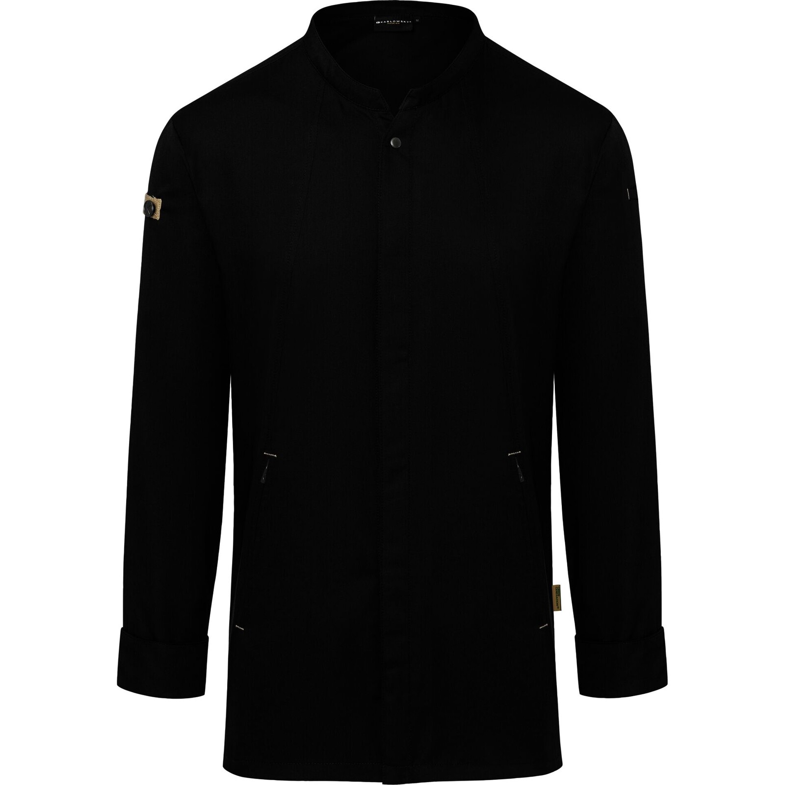Farbe: schwarz. Vorderteil 65 % Polyester (recycelt), 35 % Baumwolle, Rückseite 100 % Polyester. Innovative nachhaltige Kochjacke, die urbanen Style mit natürlichen Flair verbindet. Polyesteranteil aus recyceltem Plastik, leicht tailliert geschnitten, Rückeneinsatz aus Jersey Pique sorgt für angenehme Belüftung und erhöhte Bewegungsfreiheit, mit Druckknöpfen zum schnellen Öffnen und Schließen, Ärmelmanschetten mit Druckknöpfen, Vorderteil mit Reißverschlusstaschen und Leistentasche am linken Ärmel, stylische Applikationen aus Kontrastbändern an den Ärmeln und im Nacken für eine urbane Optik.