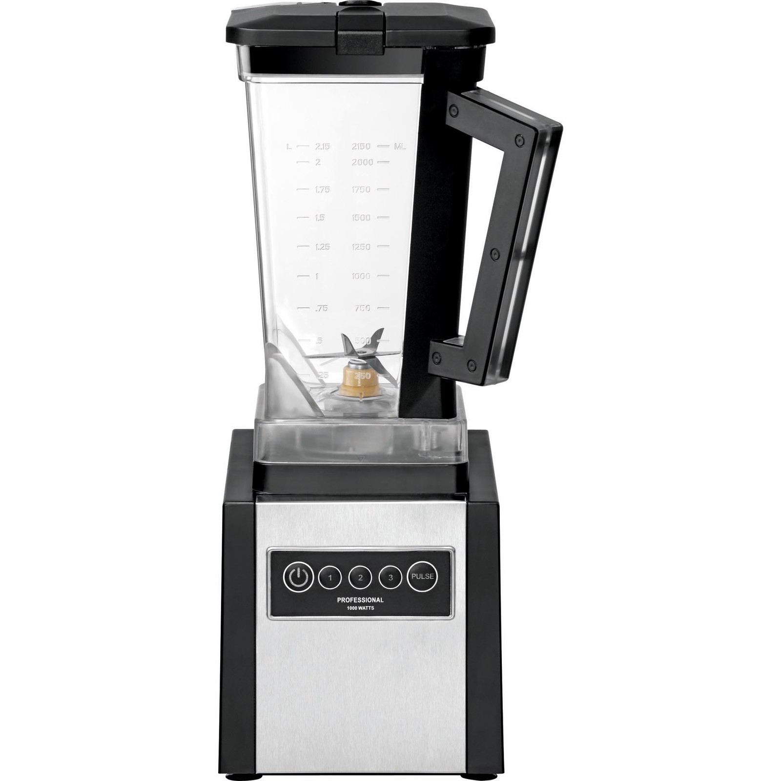 Gehäuse Edelstahl-Kunststoff, Mixbecher aus Kunststoff, Messer CNS 18/10. 3 Geschwindigkeitsstufen, Pulse-Funktion, Ein-/Ausschalter, Mixbecher: Inhalt 3,2 Liter. Füllmenge: max. 2,15 Liter, Sicherheitsschalter am Deckel, Verschließbarer Ausgießer. Ice-crushen möglich. Geschwindigkeitsstufen (nach Herstellerangaben): Speed I: 4432 UpM +/- 15 %, Speed II: 5330 UpM +/- 15 %, Speed III: 6073 UpM +/- 15 %, Ice: 6073 UpM +/- 15 %.