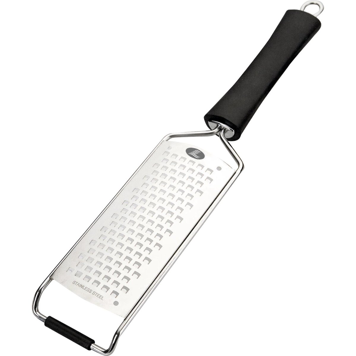 Reibe Edelstahl, Griff Kunststoff, schwarz, oval geformt.