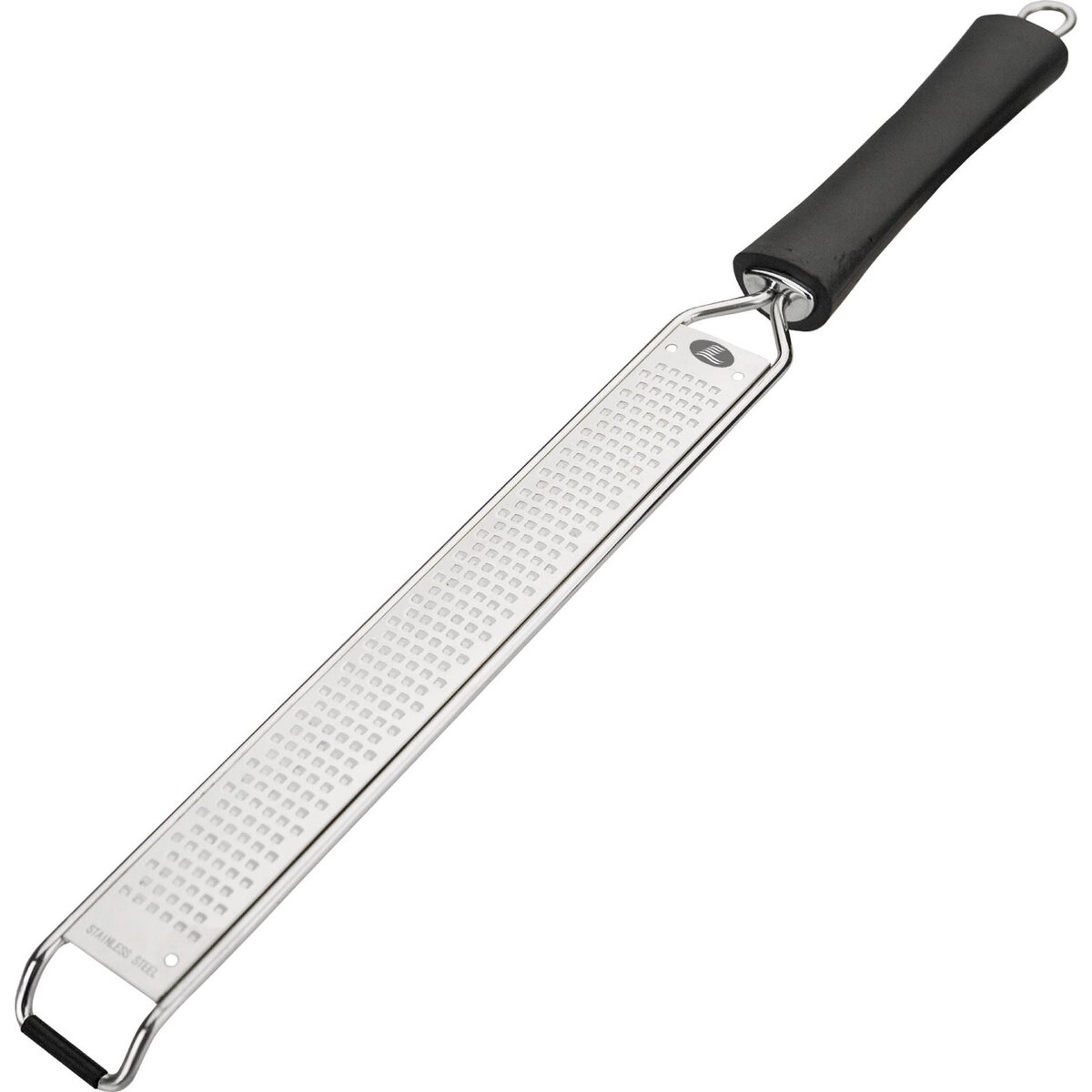 Reibe Edelstahl, Griff Kunststoff, schwarz, oval geformt.