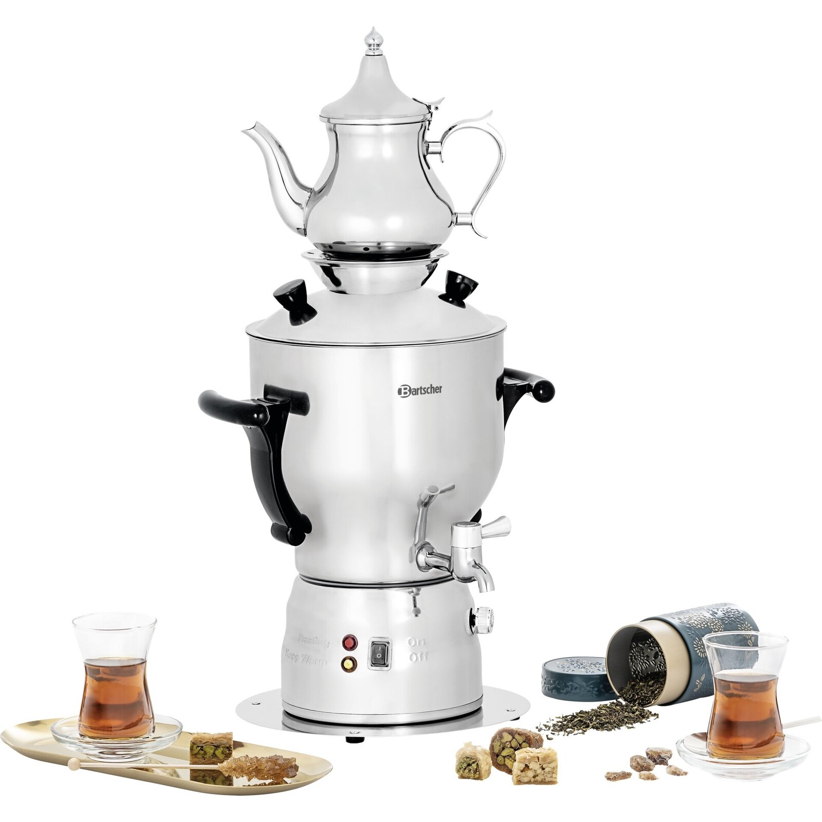 Edelstahl, stufenlose Temperaturregelung, Überhitzungsschutz, Warmhaltefunktion, Temperaturbereich 30°C-100°C, automatische Abschaltung, Gläser/Tassenhöhe max. 12,5 cm, inkl. 1 Teekanne Inhalt 1 Liter, Teesieb.