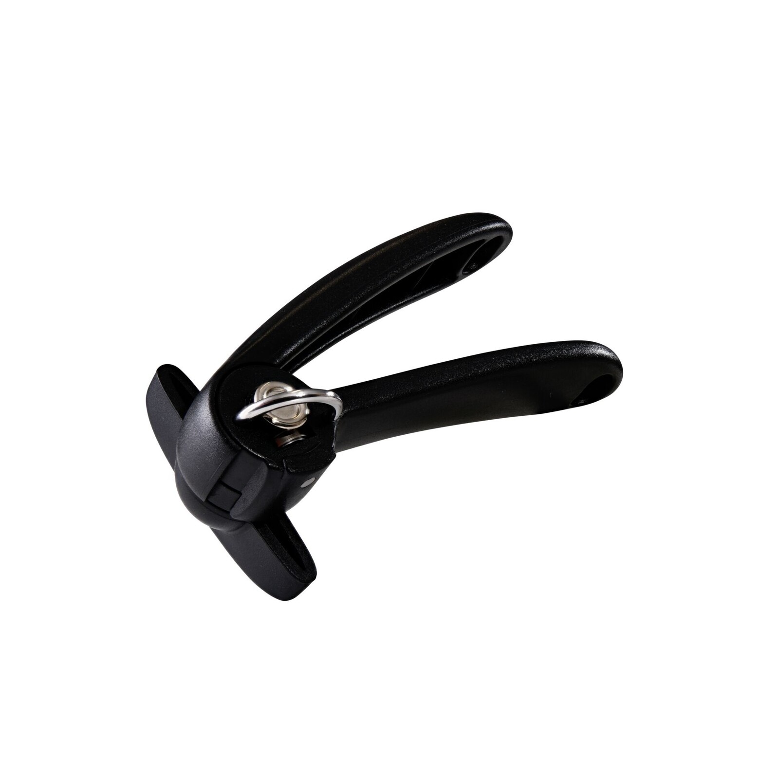 ABS, schwarz/Edelstahl. Sicherheitsdosenöffner mit „keine scharfen Kanten Schneidsystem“, schneidet Dosen am Rand ein, Deckel kann so wieder aufgesetzt werden.