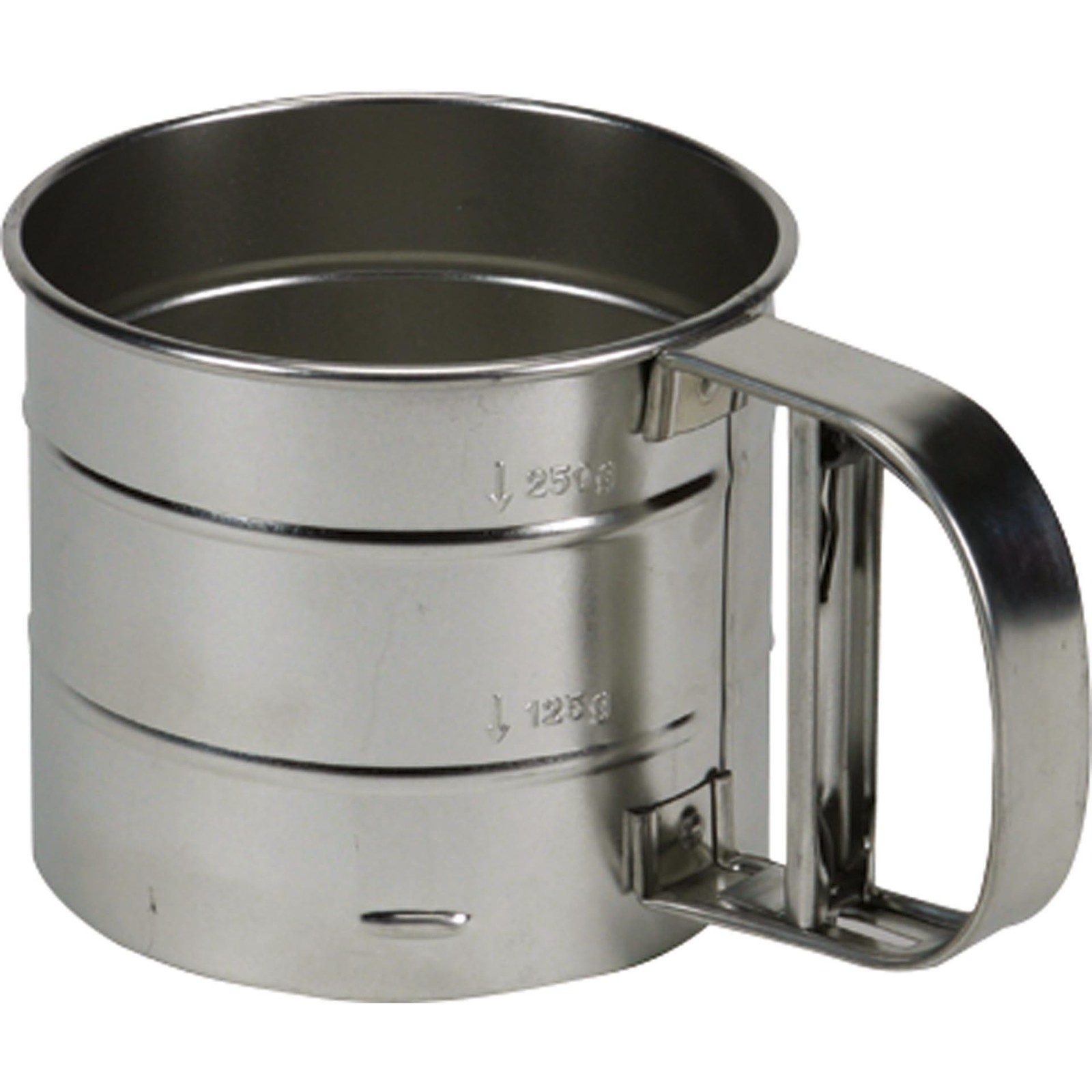 Edelstahl, mit Einhandmechanismus. Zum Beispiel für Puderzucker, Kakao oder Mehl.