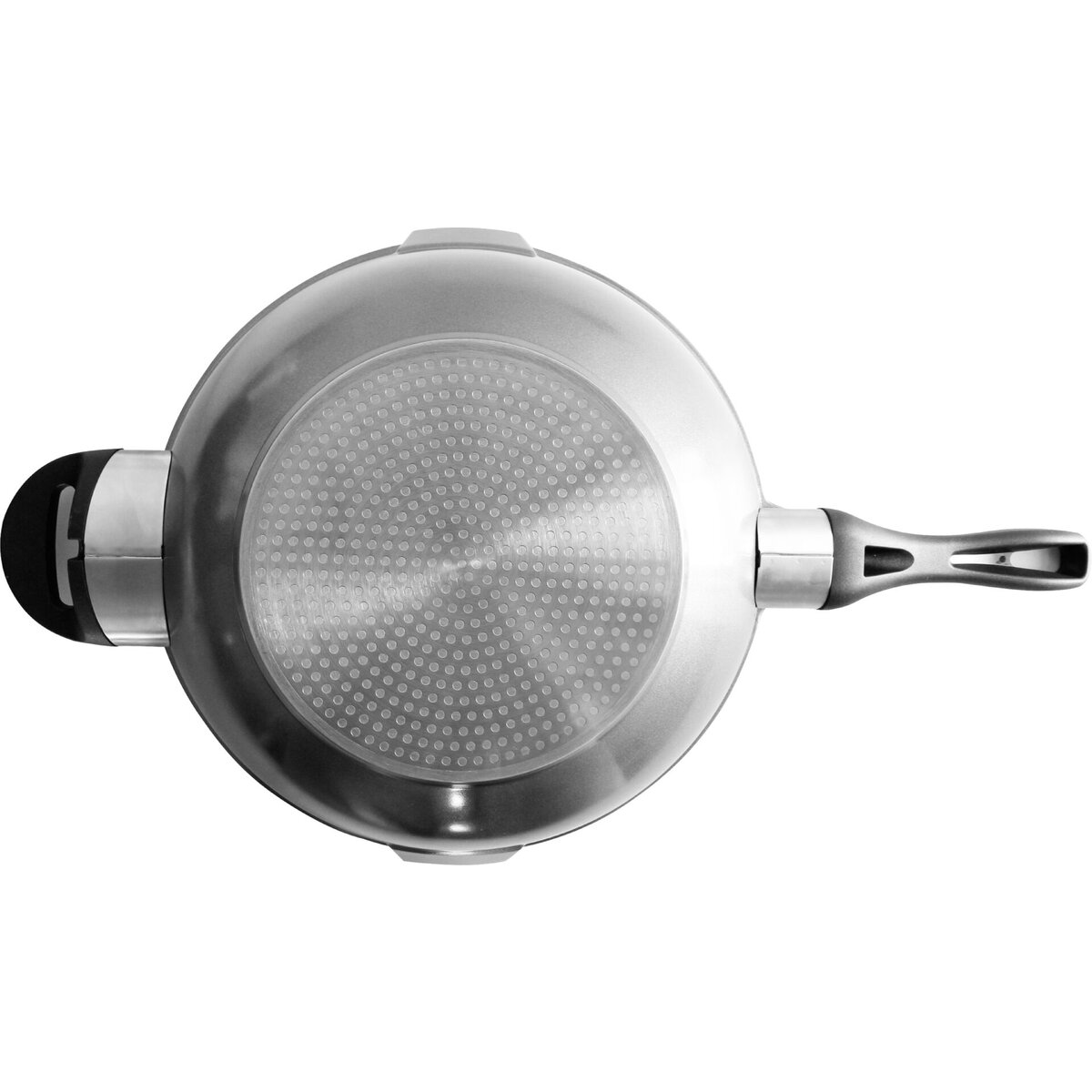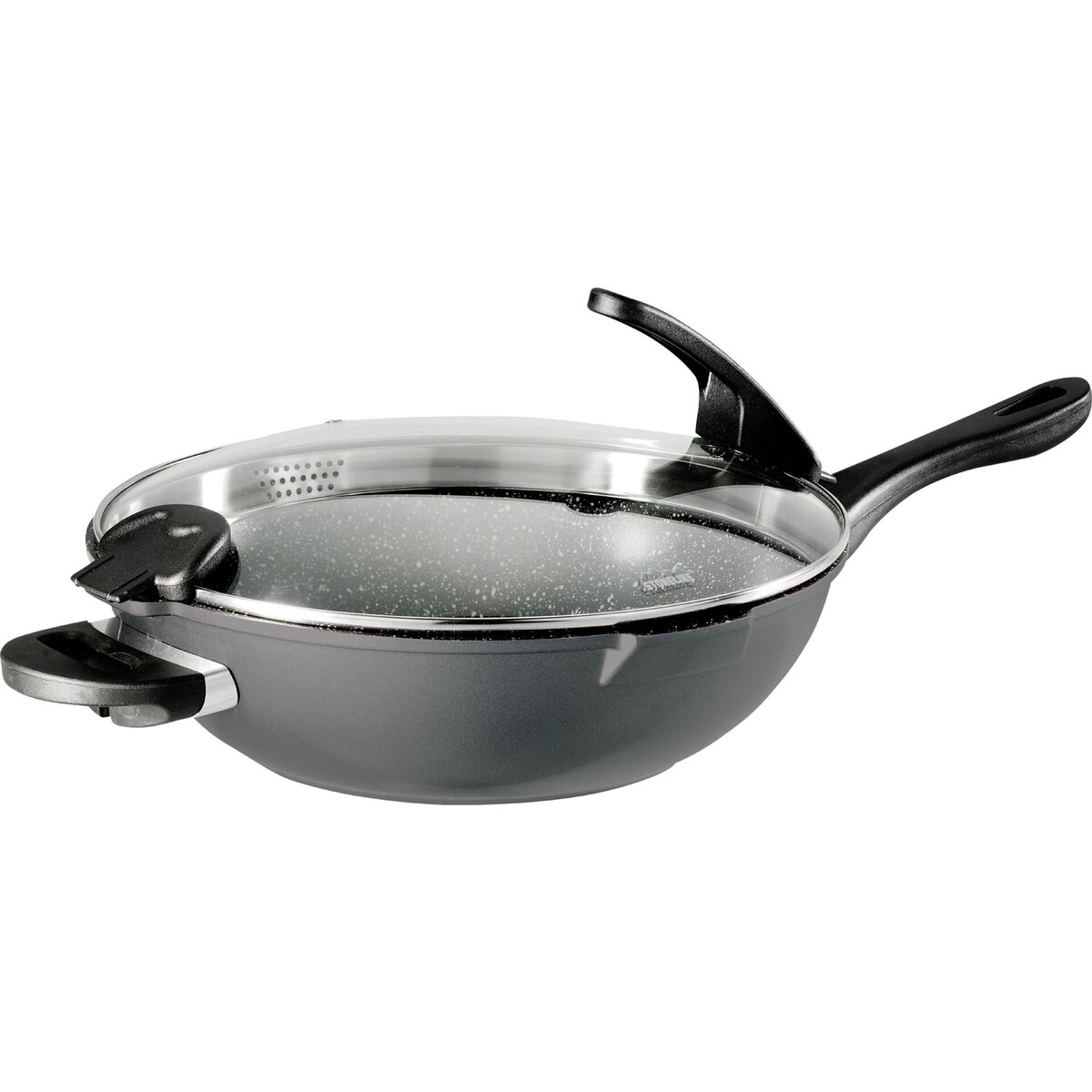 Aluguss. Antihaft. Siebglasdeckel. Kunststoffgriff. Bodenstärke: 4,5mm. 2 breite Ausgüsse und Spezialdeckel mit Siebfunktion, Flüssigkeit fließt wieder zurück in die Pfanne dank Deckelhalterung. Robuste, harte und kratzfeste Beschichtung. Gesund und fettfrei Braten wie auf Naturstein, schnelle und gleichmäßige Wärmeübertragung. Hitzebständig bis 180°C. Für alle Herdarten geeignet, auch Induktion.